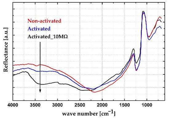 FTIR spectra of the tested samples: red—non-activated sensor; blue—activated sensor with open ends; black—activated sensor connected to a 10 MΩ resistor.