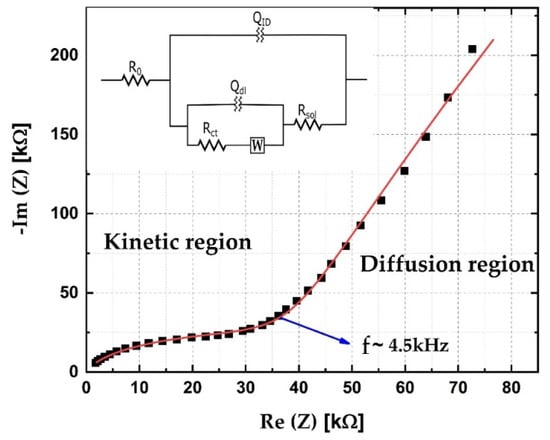 The electrochemical characterization of the sensor was conducted via electrochemical impedance spectroscopy. Measurements were obtained using the Ivium Vertex 46804 (Ivium, The Netherlands) in a frequency range from 300 Hz to 200 kHz, with the shorted reference electrode and counter electrode, at the open circuit potential. In order to make the electrochemical reaction possible, a droplet of demineralized water was placed on the sensor’s surface. A Nyquist diagram is presented in Figure 11, together with the fitted data. The equivalent circuit which was used for analyzing the impedance data is given as an inset in Figure 11. Capacitive contributions were analyzed as constant phase elements (CPE), whose impedance is defined as:
