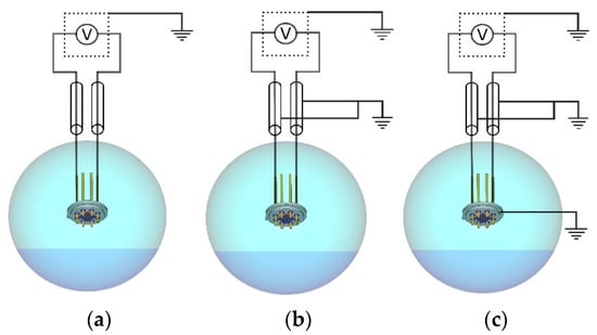Measurement configurations: (a) voltmeter is grounded; (b) voltmeter and cable shields are grounded; (c) voltmeter, housing, and cable shields are grounded.