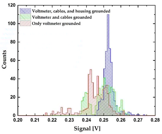 Histogram of the signal: red—voltmeter is grounded; green—voltmeter and cable shields are grounded; blue—voltmeter, shields, and housing are grounded. Number of events is 501 in all cases. Bin size is 1 mV.