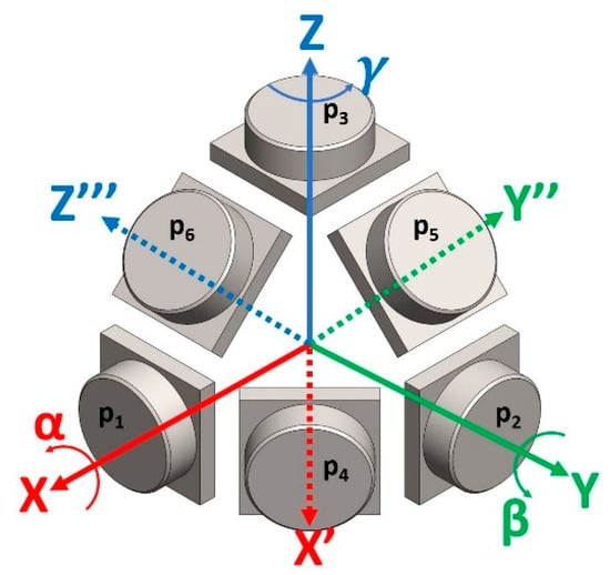 In this spatial disposition, the three auxiliary sensors do not form a cartesian reference system, but each must be considered as one axis of three separate reference systems. To obtain these reference systems, the original reference system XYZ was rotated by a 45° rotation, respectively. This is formalized by introducing the basic rotation matrices AX, AY, and AZ, which bring the coordinates of the XYZ reference system to the auxiliary systems. In this case α, β, and γ are equal to 45°, and the three rotations about its X, Y, and Z axes align the auxiliary sensors to the Y′′, Z′′′, and X′ axes, respectively.