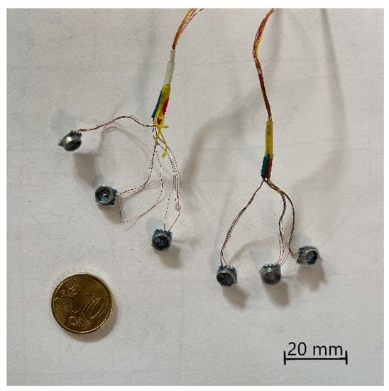 The strands of each triads were wrapped around a fishing line made of Dyneema (diameter: 0.30 mm, tensile strength: 230 N) to increase the strength of the cable. Sensors soldered to this cable are shown in Figure 2.