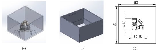 Figure 3. Casting molds: (a) Lower mold with the positive print used to create the cavity for the sensor positioning, marks are printed to the surfaces to indicate the sensor position and identify the cube axes. (b) Upper mold used to complete the cube, marks on the surfaces allow for alignment of the mold over the first half of rubber specimen. (c) Position and size of the stress probe inside the testing specimen, the volume occupied by the actual sensing probe is confined to a cube of 17 mm side.