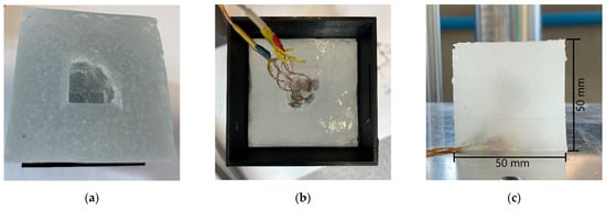 Figure 4. Casting procedure: (a) Result of the first cast, the upper part of the specimen is realized with a cavity to insert the sensors. (b) Sensor positioned inside the cavity; uncured silicone rubber is added to make the sensor adhering to the cured material. The upper cast is positioned for the final step. (c) Result after the casting, sensors are embedded, and their cables exit from a vertex of the specimen.