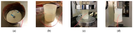 Figure 5. Preparation and testing of the uniaxial pressure sensor: (a) Pressure sensor positioned over the first half of the rubber specimen. (b) Cylindrical specimen ready for the test. (c) Compression test. (d) Tension test.
