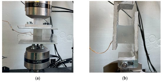 Figure A1. Specimen during the characterization test. (a) Tension. (b) Compression. (c) Shear.