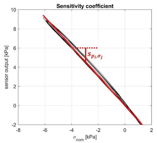 To analyze the data, we used the software MATLAB R2020b (MathWorks). First, data were filtered using a lowpass filter with cut-off frequency of 2 Hz. Then, we calculated the nominal pressure pnom applied to the specimen by dividing the force by the nominal area of the specimen, equal to 2.5 cm2. This pressure was equal to the opposite of the σ during the compression test and equal to the τ during the shear test. Using the pnom and the output of the pressure sensors, we calculated the sensitivity matrix S of the MAPS probe. To fill this matrix, we computed each of the sij terms as the linear regression between data from the sensor outputs and the nominal load, as shown in Figure 7.