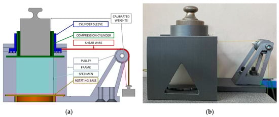 The compressive load was applied thanks to a cylinder, which had housing for placing calibrated weights and was constrained to slide along a sleeve. To apply the shear load, the sleeve was mounted on two linear guides and pulled by a wire trough a pulley system. Finally, to test the two directions of shear on the same plane, a rotating base was located over the base of the frame, allowing us to test multiple shear directions without repositioning the specimen. A sketch indicating the components of the test bench and a photo of it during a test are shown in Figure 8. The described test bench allowed us to compress the cube with a weight of 500 g, while also applying a shear load with a weight of 100 g. These two loads corresponded to a σnom equal to −1.96 kPa and a τnom equal to 0.39 kPa. When the two loads were applied together, the nominal σid,VM was equal to 2.07 kPa.