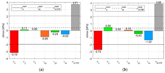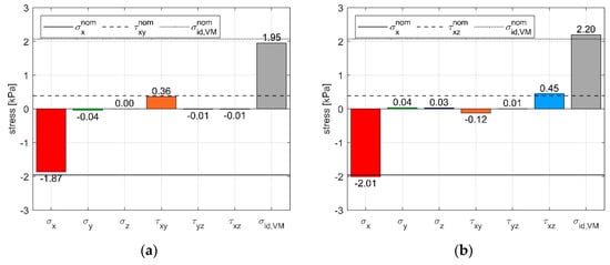 We also computed the stress components that we obtained by the analytical solution described in the methods, which are shown in Figure 12. Qualitatively, the applied stresses were identified correctly; however, those were amplified when compared to the nominal load applied to the specimen resulting in higher errors with respect to the stress state estimated by using the calibration matrix, and a higher cross-sensitivity was found. As a consequence, the σid,VM, which was calculated using the analytical approach, was 85% higher with respect to the σid,VM nominal.