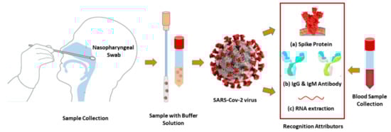 Coronavirus samples (virus spike RBD or RNA) and anti-spike protein (IgG or IgM) can be collected from nasopharyngeal swabs (NPS) and blood, respectively. They are placed immediately into viral transport media (VTM) kits, as illustrated in Figure 1.