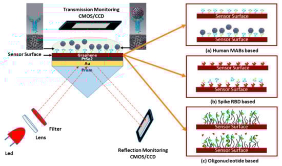The third layer can be formed of by (i) sputtering the platinum (Pt) onto the SiO2 substrate and (ii) SiO2/Pt layer can be selenized with selenium (Se) steam (at 400 °C under 150 sccm of 10% H2/Ar flow) by thermally assisted conversion (TAC) for two hours [40,41,42,43]. (iii) The polymethyl methacrylate (PMMA) layer can be assisted with a SiO2/Pt stack in a spin-coated process to transfer the film onto the Au layer. (iv) The SiO2 layer can be removed by a wet etching process using 2 M NaOH at 25 °C. (v) The developed PMMA/ stack can be cleaned in de-ionized (DI) water, transferred onto the BK7/Au substrate, and PMMA can be removed by applying acetone ((CH3)2CO) [40,44,45,46]. Then, the possible graphene film synthesis onto the layer includes the following steps [47,48,49,50,51]: (i) A high-quality graphene film (5 layers × 0.34 nm = 1.7 nm) can be grown onto the copper (Cu) foil by chemical vapor deposition (CVD) method at 1000 °C under a chamber pressure of 3.6 Torr by using methane (CH₄) gas as a carbon source for five minutes [47,48,49,50,51]. The CH₄ and Ar/H2 gas flow ratio can be maintained by operating the control valve [47]. (ii) The PMMA layer can be assisted with a Cu/graphene stack at a spin-coated process (spin rate 2000 r/min, at 175 °C) for five minutes to transfer the graphene film onto the target substrate. (iii) The Cu foil can be etched by the sulfuric acid (H2SO4) at 25 °C. (iv) The developed PMMA/graphene stack can be cleaned in DI water, transferred onto the BK7/Au/PtSe2 substrate, and PMMA can be removed by applying (CH3)2CO. In step 2, the possible immobilization process of the specific probe onto the graphene film for future development is as follows: A specific probe (sh) and the mismatching (wt) oligonucleotide solution can be taken, which has an equal concentration of 0.3 µM, and the target matching (mr) oligonucleotide solution has a concentration from 0.15 µM to 0.3 µM. The PBSE can be dissolved in (CH3)2SO (DMSO) to prepare a proper linker reagent that has a concentration of 5 mM. For possible immobilization of PBSE onto the graphene layer, the linker reagent can be added onto the graphene film for two hours at 25 °C. The immobilized graphene film by PBSE can be dissolved in probe oligonucleotide for four hours at 25 °C to confirm enough conjugation among the probe and the PBSE [52]. Similarly, the possible immobilization of antibody or spike protein onto the graphene film layer is as follows: The graphene film can be moistened in 2 mM PBSE in CH₃OH for one hour at 25 °C and cleaned many times with PBS (pH 7.4) solution with DI water. After that, the functionalized graphene film can be exposed to 250 μg/mL ligands (mAbs, or Spike RBD) for 4 h [30].