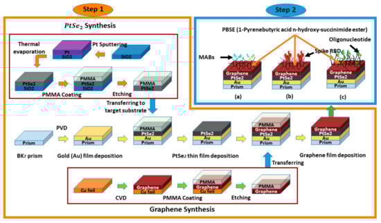 Schematic diagram of the possible multi-layer film fabrication process of the proposed SPR sensor for detection of the SARS-Cov-2 virus;—in step 1, the sensor Bk7/Au/PtSe2/graphene layers are deposited sequentially, the synthesis technique of PtSe2 and graphene film are also depicted. In step 2, the ligands;—(a) mAbs, (b) spike RBD, and (c) probe oligo are immobilized with the graphene layer through PBSE.