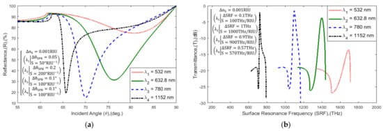 In the beginning, the proposed hybrid sensor performance was analyzed at different excitation wavelengths. Commercially available SPR biosensors such as Biacore-3000, SPRm-200, and Spreeta-2000 operate at a wavelength of 690 nm, 780 nm, and 830 nm, respectively [64,65]. The RI of sensor materials changes during the different excitation wavelengths, which is tabulated in Table 1 [34]. In Figure 5, the proposed sensor is operated at four different widely used wavelengths of 532 nm, 632.8 nm, 780 nm, and 1152 nm. The sensor SPR ~, SRF curve characteristics, and sensitivity at different operating wavelengths are tabulated in Table 2. The table highlights that the maximum sensitivity of the sensor is 200°/RIU and 1000THz/RIU at a 632.8 nm wavelength. Therefore, the proposed sensor is operated at a wavelength of 632.8 nm He-Ne laser light.