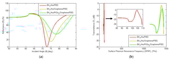 As a second factor, the proposed SPR sensor is compared with other conventional sensors, as shown in Figure 6. In addition, Table 3 shows the evaluated results for minimum reflectance (), SPR angle (, maximum transmittance , surface resonance frequency (), sensitivity, FWHM, DA, FOM, and QF for three different structures of the SPR sensor model (. In a three-layer model (Bk7/Au/PBS) without a graphene layer, is 0.54%, is 72.60°, is 104.19 THz, and is 0.054 dB. Similarly, in a four-layer graphene-coated model (Bk7/Au/Graphene/PBS) where is 14.8%, is 75.05°, is 1391.5 THz, and is 1.601 dB. Eventually, the proposed sensor will be covered with a total of five layers containing PtSe2 and a graphene film layer (Bk7/Au/PtSe2/Graphene/PBS), where is 35.08%, is 78.10°, is 1409.3 THz and is 4.320 dB. Equation (7) is used to calculate the sensitivity, where = 0.03 RIU. The proposed sensor’s sensitivity is enhanced to 183.3 deg RIU−1. The proposed five-layer sensor sensitivity is 6.50 times higher than that of the three-layer conventional sensor and the calculation as in (8).