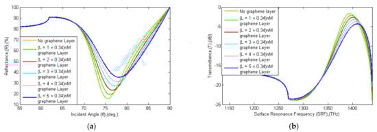In addition, the proposed sensor’s sensitivity was increased by adding the graphene film layer (0.34 nm × L), where L is the number of additions of the graphene layer [30]. The reflectance and transmittance spectra with the addition of graphene layers is shown in Figure 7, and the data is tabulated in Table 4. The sensor’s sensitivity is enhanced by the increase in graphene layers, as previously described [69,70,71]. The sensitivity () calculation with the addition of a different number of graphene layers (L = 1, 2, …, 5) is shown in Equation (9). The sensitivity with one graphene layer is 18.33 deg RIU−1 and FOM is 48.24 RIU−1. The sensitivity with five graphene layers is 88.33 deg RIU−1 and FOM is 38.24 RIU−1. The proposed sensor sensitivity is enhanced (1 + 0.55) × L times with the addition of graphene layers. An observation in Table 4 points out that the sensitivity, FWHM, and QF are increased but FOM and DA are decreased with the addition of graphene layers. The ideal number of graphene layers was between 2 and 5 graphene layers for optimum sensitivity, QF, as well as DA and FOM [55]. In the proposed sensor, a maximum of five-layer graphene film was added to achieve maximum efficiency [31].