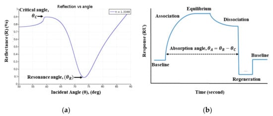 The ratio of reflectance and incidence angle is familiar as the SPR curve. The incident angle is recognized as the , which can be expressed as [23,60]: