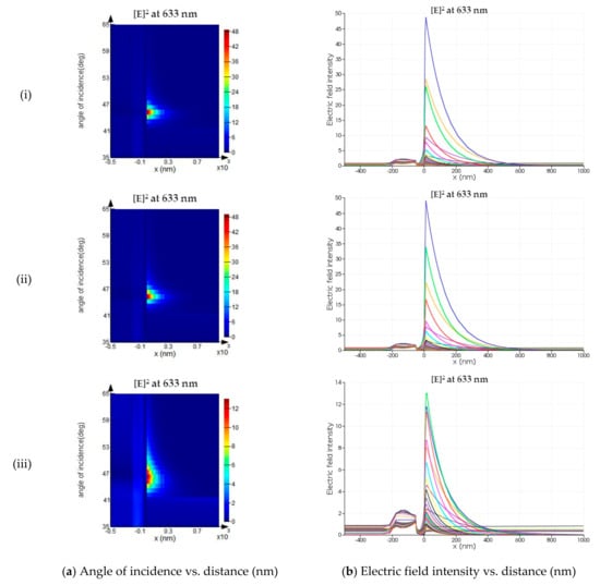 Furthermore, electric field intensity is evaluated for the developed sensor, comparing it with other conventional sensors. In Lumerical FDTD, the angular interrogation technique is utilized to estimate the SPPs excitation near the sensor surface. The SPPs’ excitation produces an evanescent wave that decays exponentially with distance in a direction normal to the boundary [75]. The SPPs’ electromagnetic field intensity is maximum at a resonance angle of the incident light [75]. In Figure 9, the electric field intensity and angle of the incident concerning normal distance from the sensor interface are monitored for the three-layer, four-layer, and proposed five-layer SPR sensor. The strength of electric field intensity is enhanced near the surface in the proposed SPR sensor, compared to the other conventional sensor. Thus, the sensitivity of the proposed sensor is increased enormously for the detection of target analytes.