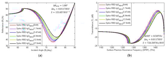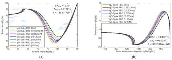 In Figure 10, the SPR and SPRF curve characteristics are illustrated with the different concentration levels of SARS-CoV-2 Spike RBDs flows as analyte. The ~ and characteristics are calculated in Table 5, with the variation of the analyte. In the simulation, the RI of PBS solution (concentration of 500 nM) without virus spike RBD was computed using the AIDA that has flowed onto the sensor surface, where is 36.25%, is 78.50°, is 1411.3 THz and is 4.5017 dB calculated, respectively. Similarly, the RI of PBS solution with SARS-CoV-2 virus spike RBD (concentration of 1.95 to 62.5 nM) that flowed onto the sensor surface was computed. The RI is changed due to the interaction of different concentrations of mAbs and SARS-CoV-2 spike RBD. Due to the absorption of 1.953125nM SARS-CoV-2 spike RBD, the detection attributors shift right by 0.35° (from 78.50° to 78.85°) and 1.8 THz (from 1411.3 THz to 1413.1 THz). Furthermore, reflectance (R) and transmittance (T) also changed by 1.27% (from 36.25% to 37.52%) and 0.2018 dB (from 4.5017 dB to 4.7035 dB). Similarly, the detection attributors change with the absorption of SARS-CoV-2 spike RBDs; otherwise, the status would remain the same.
