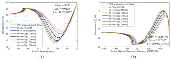 Currently, the RT-PCR method is being applied to detect the SARS-CoV-2 virus. However, RNA extraction of the SARS-CoV-2 Spike is a long-time process. It takes more than one to three days to get a clinical report. To overcome this time-consuming procedure of RNA extraction, Zhao et al. developed a pcMNPs technique for RNA extraction (required ~30 min) [10]; it has been identified as a subsequent RT-PCR method. The sensor graphene layer can be attached to specific probe RNA sequences via PBSE to diagnose specific RNA sequences. This proposed sensor can detect hybridization events among the target SARS-CoV-2 spike RNA sequence and the probe RNA sequence. In Table 7, forward-reverse primers and probe genome sequences are specified with nucleotide position for detection of the RNA sequence of the COVID-19 virus [82,83,84]. In addition, the entirely matching (mr) sequence and mismatching (wt) sequence with probe (sh) linker is tabulated. In Figure 12, the SPR angle and SRF shifted right with the variation of different concentrated target RNA sequences. The detection attributor ~ and are calculated with probe (sh) sequence, where is 37.92%, is 78.95°, is 1413.7 THz, and is 4.7670 dB. The attributors’ shifting parameters are tabulated in Table 8.