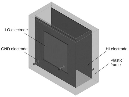 A container-type probe was selected to use when measuring the dielectric properties (electrical capacitance and dissipation factor) of wood chips due to its advantages of higher accuracy and lower sensitivity to different fuels [13]. Therefore, a plastic box was constructed to be the probe. The box was made of 20 mm thick plastic plates that were glued and screwed together with plastic screws, ensuring the box was sufficiently strong. The inner dimensions of the box were 100 × 260 × 250 mm (resulting volume 6.5 dm3), and the outer dimensions were 140 × 280 × 290 mm. The arrangement of the electrodes is clear from Figure 1.