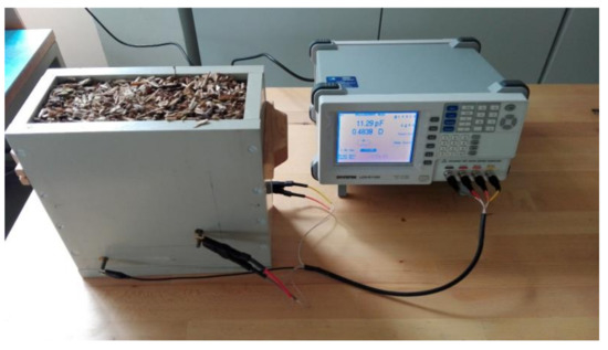 Parallel-plate capacitance sensors are also often used for MC determination. Kandala and Sundaram [26] measured the MC of grains and nuts (which is similar to wood chips) with this method at frequencies from 1 to 9 MHz. They measured the impedance and phase angle at two frequencies, 1 and 5 MHz, and also measured the capacitance value. They concluded that using a simple low-cost impedance meter and capacitance sensor, the MC of peanut and corn samples could be determined rapidly and non-destructively. Then, Kandala et al. [27] used a similar sensor for the measurement of the MC of different varieties of wheat. Impedance and phase angle were measured at 1 and 5 MHz. They concluded that the system was sufficiently accurate in the MC range between 9% and 25% and that measurements at two frequencies helped to eliminate measurement errors. Pan et al. [28] also tested coupled dielectric and impact sensor for simultaneous moisture content and mass flow of wood chips determination.