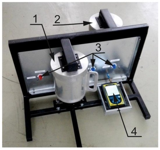 Assembly of the apparatus for measuring the volume of particulate solids (wood chip porosity). (1)—sample cylinder, (2)—reference cylinder, (3)—air valves, (4)—Cressto DMS 1 pressure gauge.