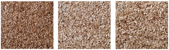 Individual fractions of pure oak wood chips after screen analysis. (1)—less than 3.15 mm, (2)—3.15 to 5 mm, (3)—greater than 5 mm.
