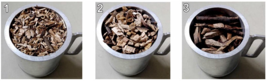 The experiments were performed with pure and forest wood chips. Pure oak wood chips with individual particle sizes ranging from 1 to 10 mm were purchased from butcher’s supplies for measurement purposes. Pure wood chips were divided into 3 fractions with a volume of about 20 dm3 by screen analysis: (1) those less than 3.15 mm, (2) 3.15 to 5 mm, and (3) those greater than 5 mm. A view of the individual fractions of pure wood chips is shown in Figure 4. The intention was to capture the possible influence of fraction size on the measurement of dielectric properties. Initially, all 3 fractions thus obtained were placed in water at 12 °C for 24 h. This increased the moisture content of the pure wood chips to about 52% (wet basis). The material thus prepared was then placed in plastic bags, which were subsequently hermetically sealed.