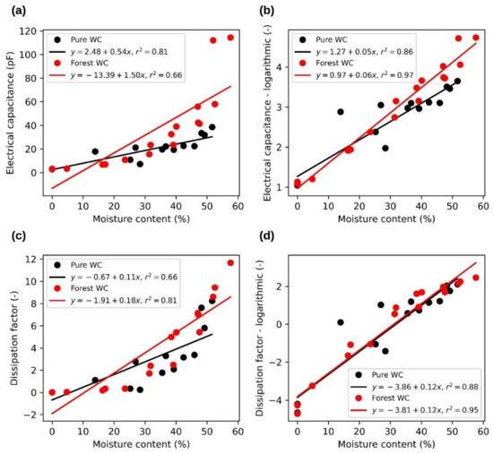 Relationships between wood chip moisture content and dielectric properties at 100 kHz. (a)—dependence of electrical capacitance on moisture content, (b)—dependence of logarithmic electrical capacitance on moisture content, (c)—dependence of dissipation factor on moisture content, (d)—dependence of logarithmic dissipation factor on moisture content.