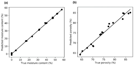 Examples of relationships between real data and predicted data. Plotted data for forest wood chips without logarithmic adjustment. (a)—linear model for moisture content, R2 = 0.997. (b)—linear model for porosity, R2 = 0.962.