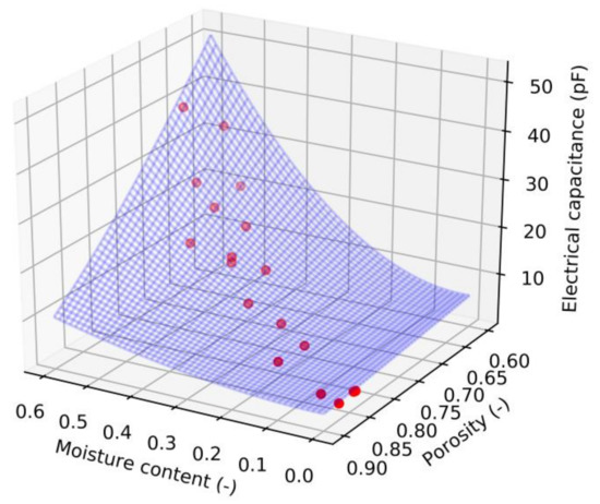 Plotted measured capacitance data (red points) for forest wood chips at1 MHz frequency and mathematical model based on the Equation (5)—blue surface.
