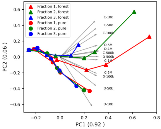 Principal component analysis (PCA) of the dielectric data for pure and forest wood chips. The arrows show a contribution of the dielectric quantities to individual components. The values of the principal components are normalized and range from −1 to 1.