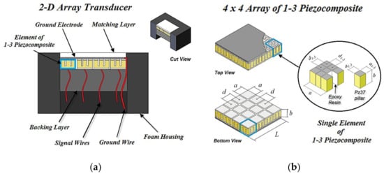An overview of the parts of the 2-D array ultrasonic transducer developed in this paper is shown in Figure 1. It consists of a 4 × 4 matrix of 1–3 piezocomposite elements, a matching layer, a backing layer, a foam housing, and wires for electrical interconnections.