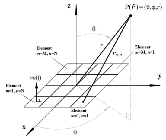 The acoustic field was simulated to assess the 3-D beam deflection, and it was performed using the software Matlab® (The MathWorks, Natick, MA, USA). The simulated fields are calculated by applying a particular analytical solution of the Rayleigh integral, which evaluates the velocity potential impulse response of rectangular transducers modeled as a rigid piston, surrounded by an infinite rigid baffle [23]. This model evaluates the acoustic field directly in the time domain with arbitrary and realistic excitations (wideband transient pulse, continuous wave, tone burst, and others). Furthermore, it also takes into account the geometry of the elements and the distance between them (kerfs). All of these features generate more realistic simulations. The transient pressure generated by the M × N array (consisting of single piston-like transducers) at point P () of a homogeneous and lossless medium, as shown in Figure 2, can be calculated as [8,23]: