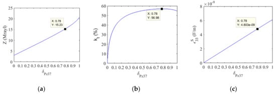 The properties of the 1–3 piezocomposite constructed in this work (acoustic impedance—Z, electromechanical coupling—kt, dielectric permittivity—) were obtained using the model described in [24], as shown in Figure 4. The use of 1–3 piezocomposite instead of pure ceramic reduces the acoustic impedance from 18 Mrayl to about 15 Mrayl when the volumetric fraction of Pz37 is δPz37 = 78% (Figure 4a). This leads to an improvement in the emission and reception of signals due to a better acoustic matching of the elements with the water. Electromechanical coupling in the thickness mode will also be increased (Figure 4b). However, the decrease in dielectric permittivity (Figure 4c) increases the reactive capacitance. This reduces the electrical matching such that less electrical energy will be transmitted to the transducer. To overcome this limitation, the reactive capacitance will be canceled close to the resonance frequency using a series inductor to match the electrical impedance.