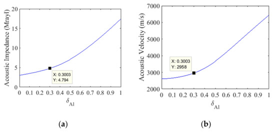 The model by Sayers and Tait [26] is used to determine the theoretical curves of the acoustic impedance and the propagation velocity of the composite mixture of particles of alumina and epoxy resin, as shown in Figure 5. From these curves, the δAl volume fraction of alumina particles to be mixed in the epoxy resin is found, which is the composite mass of the acoustic matching layer of the transducer. Initially, the volumetric fraction of alumina powder (δAl = 30%) was found, corresponding to the acoustic impedance of the matching layer, according to Figure 5a. Next, the acoustic propagation velocity of the matching layer is determined directly from the alumina volume fraction, using the curve shown in Figure 5b. Then, the quarter-wavelength-thick matching layer is calculated at the central frequency of the transducer (fo) considering the propagation velocity of 3003 m/s, resulting in close to 1.5 mm.
