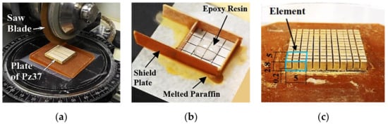 Next, again using the dice-and-fill technique, the pillars of 1–3 piezocomposite elements were made with kerfs at steps of 1.73 mm, but at that moment an overlayer of 0.2 mm thickness was left every two cuts to maintain the electrodes of the elements and the position of the pillars. This allows the maintenance of the original electrodes in those regions, simplifying the process. The cutting process resulted in nine pillars for each element of the matrix (Figure 6c). All electrodes of the pillars were joined with CW2400 conductive resin (Chemtronics, Kennesaw, GA, USA) to make the ground electrode, and the square electrodes on the opposite face of the array, each one joining nine pillars, were maintained to solder the signal wires.