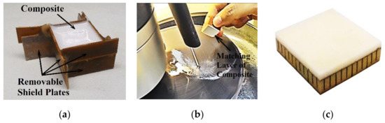 The composite mixture was deposited over the ground electrode of the transducer array (Figure 7a). After the resin was cured, the composite was manually ground on a TEGRAMIN-25 rotary grinding machine (STRUERS, Struers A/S, Ballerup, Denmark) (Figure 7b), until the matching layer thickness equal to 1.5 mm was obtained (Figure 7c).