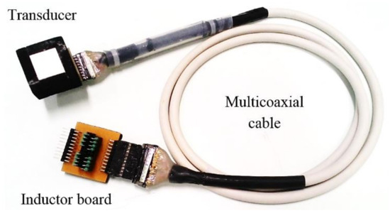 Complete transducer, with multicoaxial cable and board of matching inductors.