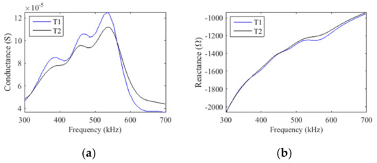 Therefore, for maximum power transmission efficiency, it’s necessary to match the electrical impedance of the transducer with the source/input [15,19,20,21]. A method to do this is adding a series inductor to null the capacitive reactance [15,19,20,21]. The series inductor was calculated as L = X/2πfo, where X is the negative reactance measured at the resonance frequency, fo, which is found where the conductance is maximum [29] (Figure 11a). The series inductors of transducer T1 and T2 evaluated with the average measured reactance (Figure 11b), were 368.8 µH and 359 μH, respectively.