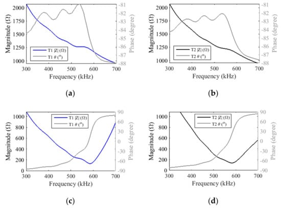 For example, the average magnitudes and phases of electrical impedance measured in air of the transducers T1 and T2 at the resonance frequency were 4058 Ω ∠ −31° @ 545 kHz and 5128 Ω ∠ −44° @ 548 kHz, respectively, whereas the measurements carried out into water were 1261 Ω ∠ −80° @ 536 kHz and 1230 Ω ∠ −82° @ 540 kHz, respectively. The electrical impedances measured of the elements are much higher than the input impedance of a typical instrument, such as the pulser/receiver unit, typically 50 Ω.