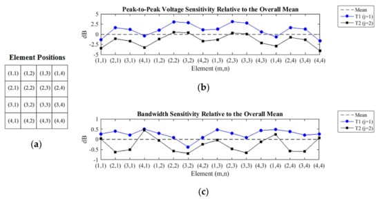 (a) The element positions are addressed as (m = line, n = column). (b) The transducer T1, j = 1, provides higher echo amplitudes and (c) broader bandwidth, being almost all of them above the overall mean, whereas the measurements of the transducer T2, j = 2, have shown worse results, mostly below the overall mean.