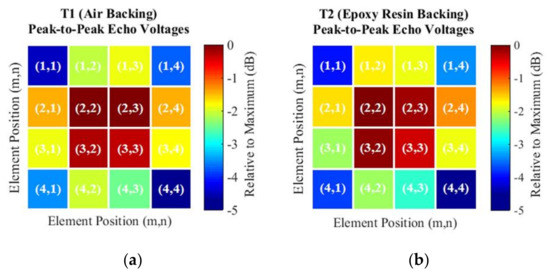 The sensitivity of the peak-to-peak voltage shows that most elements of the transducer T1 have amplitudes above the overall average, while the voltage sensitivity of the T1 transducer echoes is constantly 2.6 dB higher than that of the transducer T2 (Figure 15a). This is consistent because the transducer T2 was created from the transducer T1 only by the addition of a layer of epoxy resin with a thickness of 20 mm, without altering any other constructive characteristics.