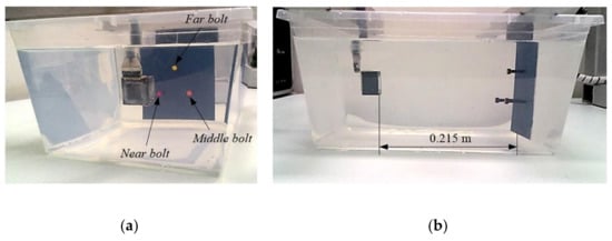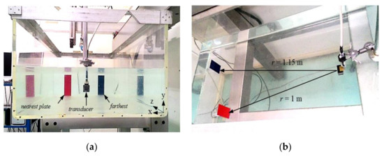 (a) Front view and (b) Top view of the experiment with faraway targets: pulse echoes from two aluminum plates of 60 mm × 160 mm immersed in a water tank of 1.4 m x 0.6 m filled up 0.2 m, were acquired with the 2-D array.