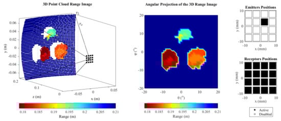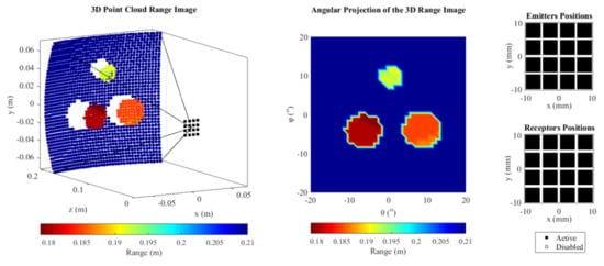 The 3-D images are depicted by converting the Irange to Cartesian coordinates using Equation (20). Thus, the image can provide the position of the discretized targets surfaces, furthermore, provides the linear distance (radius) of the targets in given azimuthal and elevation angles, with the graduated color bar (red for the nearest objects and blue for the most distant).