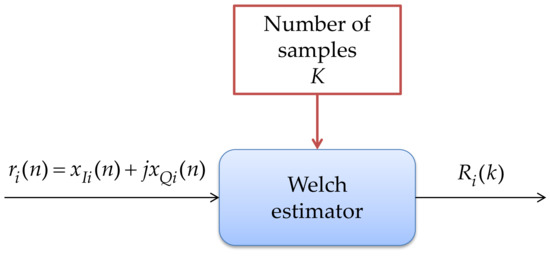 From the received signal , which is a complex signal that belongs to the time domain, the PSD is obtained on a discrete linear scale of the frequency through the Welch estimator [39] for each connected device every 100 ms (frame time).