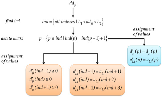With the previous processing, the indices of the detail coefficients coincide with the indices of the approximation coefficients, which also have to be modified to remove some abrupt changes when reconstructing the signal; this coincidence is due to the fact that the level of decomposition is . To modify the approximation coefficients , a close colony of three samples of approximation coefficients is replicated in the indices mentioned. In the remaining localities of the original value of is assigned.