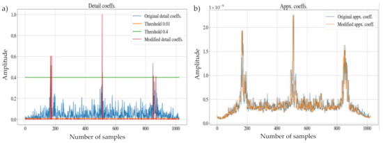 The result of this block corresponds to the approximation coefficients and the detail coefficients with the corresponding attenuations to eliminate the different noise variants mentioned above. Figure 9 shows an example of the difference between the original coefficients and those modified by this block.