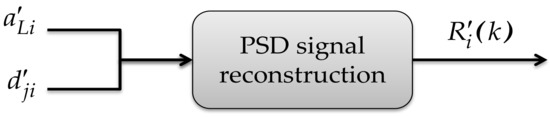 The detail coefficients of the localities and those that are around, previous, and next, are assigned the value of 1 × . Practically, the detail coefficients are turning off, such that these components do not affect the next signal to be reconstructed, which is where high-frequency noise exists. In the remaining localities of , the original value of is assigned.