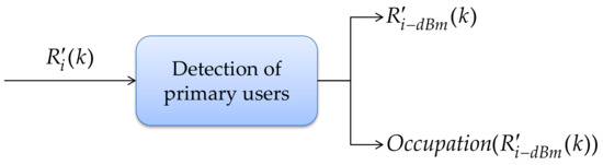 This section presents the last block of this implementation: the detection of PUs in the spectrum. This procedure receives the PSD on a linear scale as an input parameter and delivering two outputs: (i) the signal , which is the PSD on the logarithmic scale, and its occupation (i.e., starts and ends of frequency edges of detected bands); (ii) the binary decision, i.e., whether each of these detected bands corresponds to noise or a possible PU transmission. This structure is shown in Figure 13.